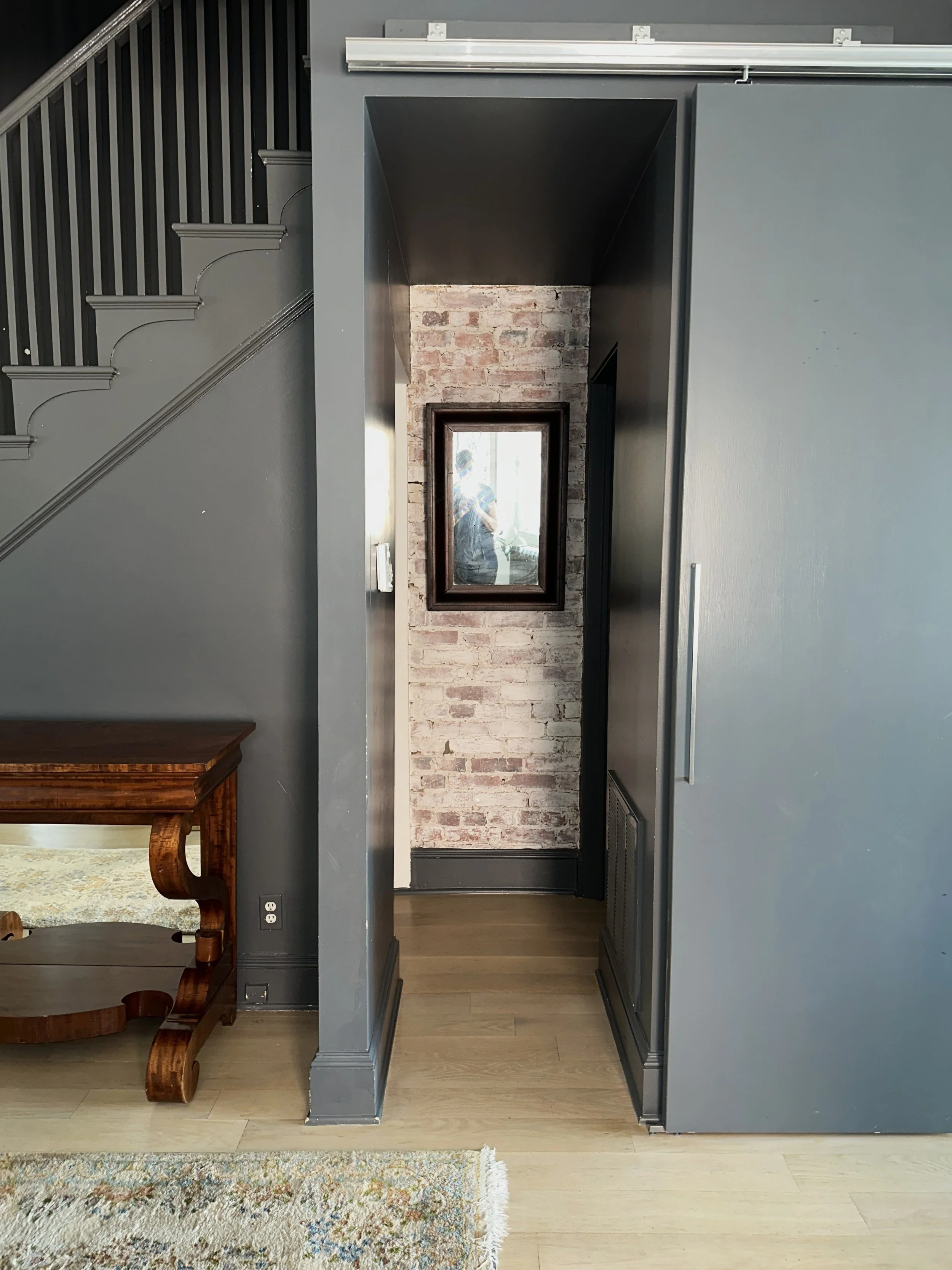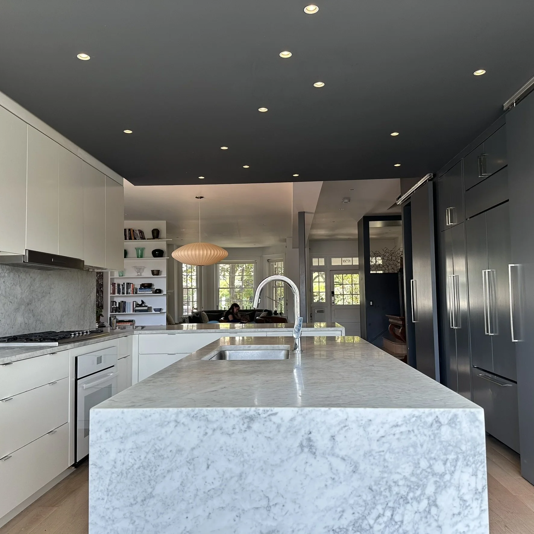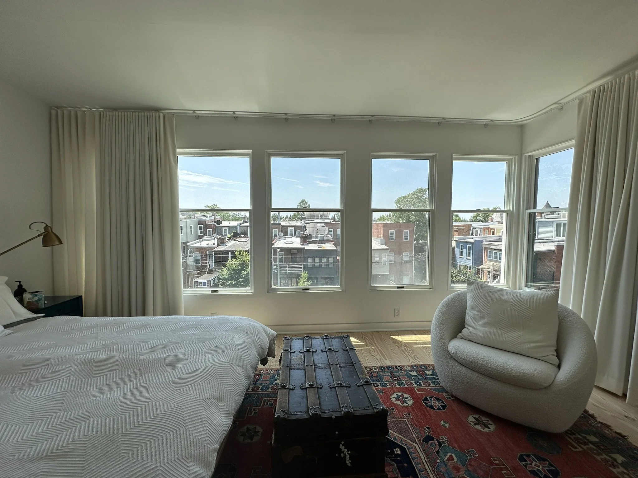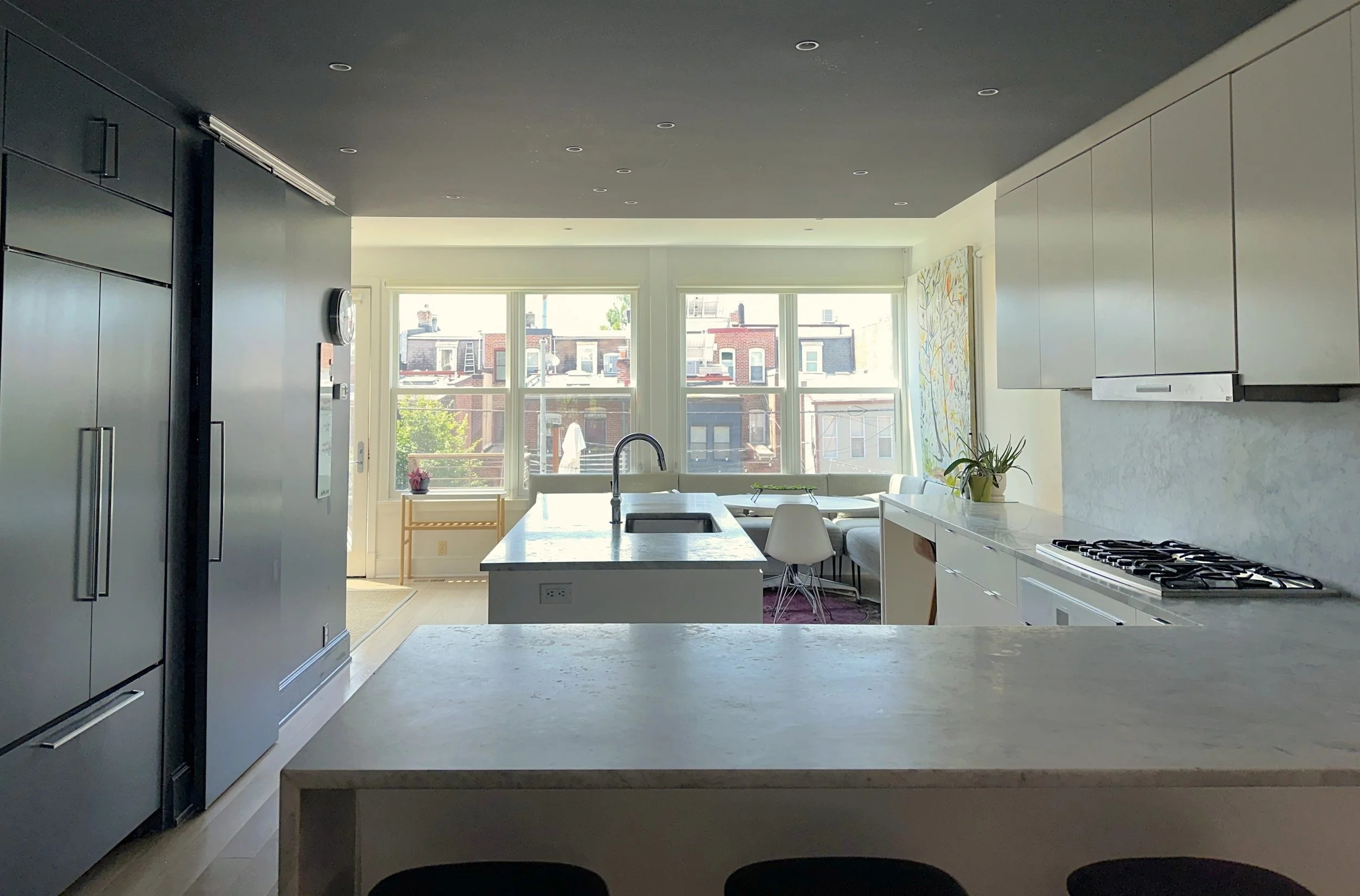 This project involved several phases to renovate a historic rowhouse in Mt Pleasant. The main floor living spaces were opened up by removing existing walls and the front living area connected to the very active kitchen space in the rear. The clients wanted a modern, clean aesthetic throughout the house. We transformed the 2nd floor main bedroom and bathroom spaces by introducing natural light to the bathroom via new large windows, and tucked the closet into an area without windows. The main bedroom now overlooks the rear garden and trees. A reading nook was created off a 3rd floor bedroom with marvelous views of the Capitol monuments, newly framed by exposing existing wood planks on one wall and matching it on the other wall, ceiling & floor surfaces.